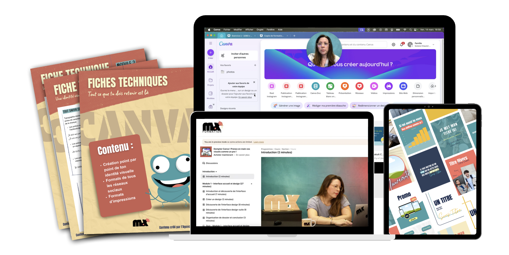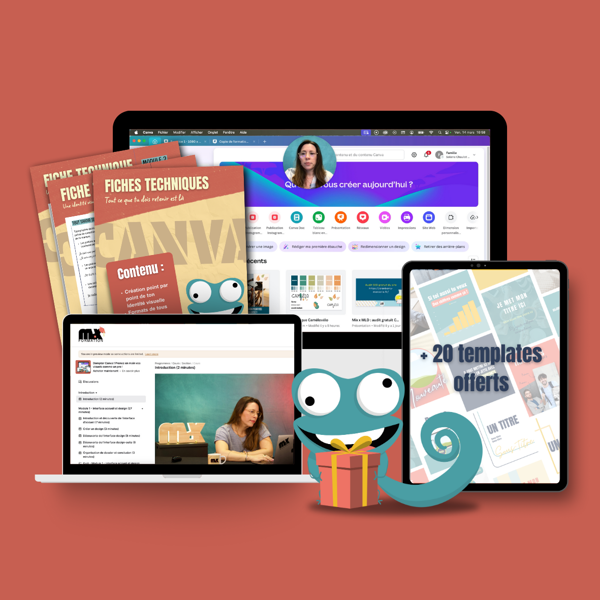 La formation est composée de 9 modules vidéo, chacun accompagné de tutos pratiques, d’exercices guidés et de fiches techniques pour tout retenir facilement. Tu avances à ton rythme, en mettant en pratique directement sur tes propres projets ou en suivant ceux de Camix Léon, notre mascotte entrepreneur.